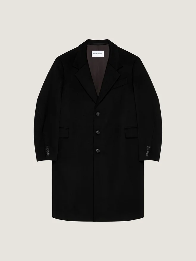 Abrigo de lana y cachemira.Solapa en V.Detalle de grosgrain en el cuello, en el interior.Cierre con botones.Puños abotonados.Un bolsillo en el pecho.Dos bolsillos delanteros con solapa.Forro de satén.• Costuras al bies para un volumen envolvente. • Corte holgado. • La modelo mide 1,85 m y lleva una talla 48. • Color • Negro • Composición • 95 % lana, 5 % cachemira. Forro: 100 % viscosa. Tratamiento muy moderadoPaís de origenItaliaCódigo del productoBmc090163S-001 Información sobre el cuidado: nuestros talleres diseñan con audacia y creatividad prendas únicas, confeccionadas con materiales de alta calidad.Para preservar el brillo de su producto Givenchy, le recomendamos guardarlo en una bolsa de algodón y en un lugar seco y fresco. Se recomienda la limpieza en seco para la mayoría de nuestros productos. Asegúrese de seguir las instrucciones de cuidado que figuran en la etiqueta de su artículo. No dude en visitar nuestra página dedicada o ponerse en contacto directamente con nuestros equipos de Givenchy si desea más información.No lavarPlanchar a la temperatura máxima de la suela (110 °C) sin vaporNo secar en secadoraNo usar lejíaLimpieza en seco profesional, con tetracloroetileno e hidrocarburos, tratamiento muy moderado