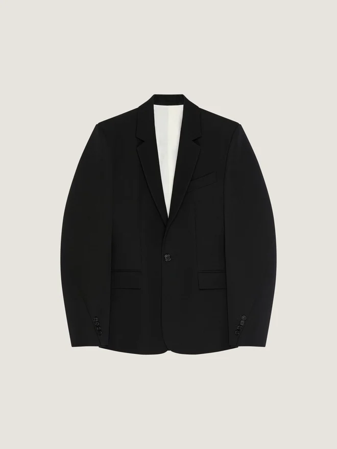 Chaqueta estructurada en lana Grain De Poudre. Solapa en V. De un solo botonadura. Puños abotonados. Un bolsillo en el pecho. Dos bolsillos delanteros con solapa
