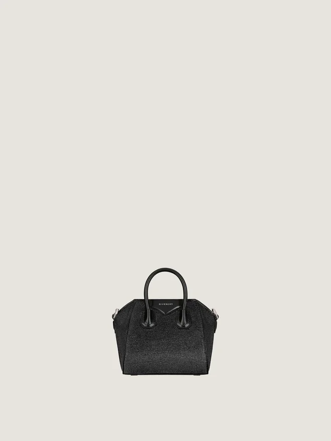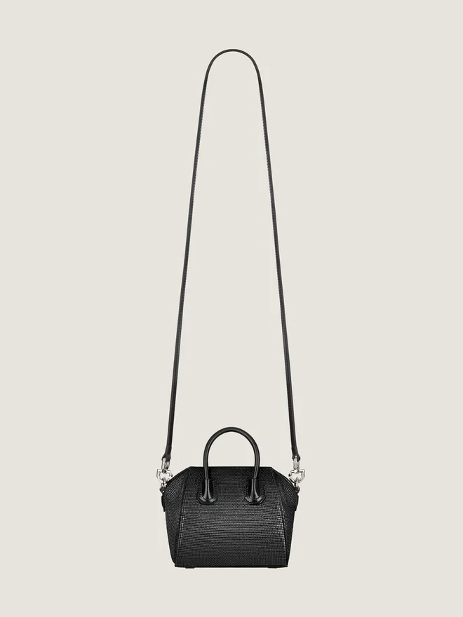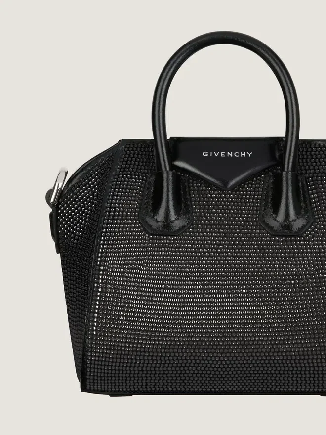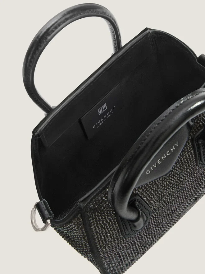 • Bolso de mano pequeño o bandolera de satén con pedrería integral.• Línea Antigona.• Cierre magnético.• Parche pentagonal de piel con el logotipo de Givenchy grabado.• Asa de piel.• Correa de hombro de piel desmontable.• Detalles metálicos con acabado plateado.• Un compartimento principal • Color • Negro • Composición • 72 % viscosa, 38 % seda. Material secundario: 100 % piel de becerro. Forro: 52 % poliuretano, 48 % poliéster. Piezas metálicas: 100 % níquel. 43 cm • Máx.: 43 cm 15 cm x 11 cm x 7,5 cm Tarjetero Sí Estuche para gafas – Paraguas de bolsillo – iPhone 13 – Libro de bolsillo – iPad Pro – MacBook Air -¿Qué cabe en tu bolso Antigona Toy? Dimensiones: 18 cm x 16 cm x 10 cm Tarjetero Sí Estuche para gafas Sí Paraguas de bolsillo – iPhone 13 Sí Libro de bolsillo – iPad Pro – MacBook Air -¿Qué cabe en tu neceser Mini Antigona Bag? Dimensiones: 18 cm x 12 cm x 8 cm Tarjetero Sí Estuche para gafas – Paraguas de bolsillo – iPhone 13 Sí Libro de bolsillo – iPad Pro – MacBook Air -¿Qué cabe en tu Antigona Bag? Dimensiones: 22 cm x 20 cm x 13 cm Tarjetero Sí Estuche para gafas Sí Paraguas de bolsillo Sí iPhone 13 Sí Libro de bolsillo Sí iPad Pro – MacBook Air -¿Qué cabe en tu Antigona Bag pequeño? Dimensiones: 29,5 cm x 24,5 cm x 16,5 cm Tarjetero Sí Estuche para gafas Sí Paraguas de bolsillo Sí iPhone 13 Sí Agenda Sí iPad Pro Sí MacBook Air -¿Qué cabe en tu Antigona Bag mediano? Dimensiones: 33 cm x 29 cm x 19 cm