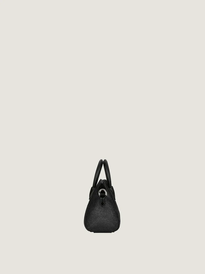 Bolso de mano micro o bolso cruzado de satén cubierto de strass en toda su superficie. Línea Antigona. Cierre magnético. Parche de cuero pentagonal