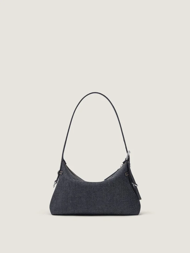 Mini bolso de hombro de denim con costuras en contraste. Línea Voyou. Cierre con cremallera. Correa de hombro ajustable que permite llevarlo al hombro