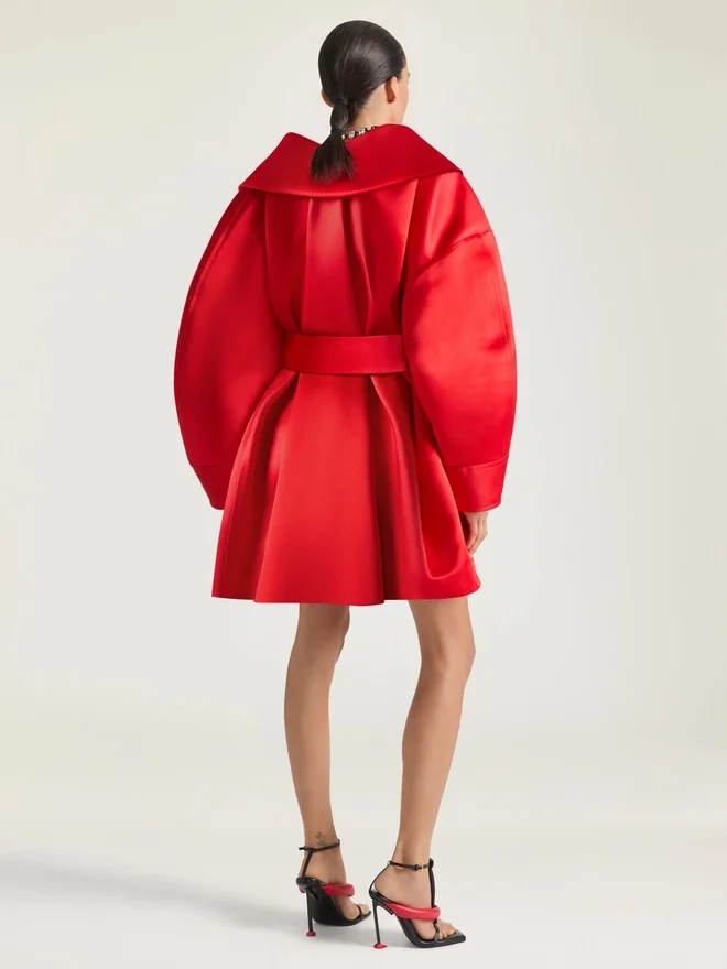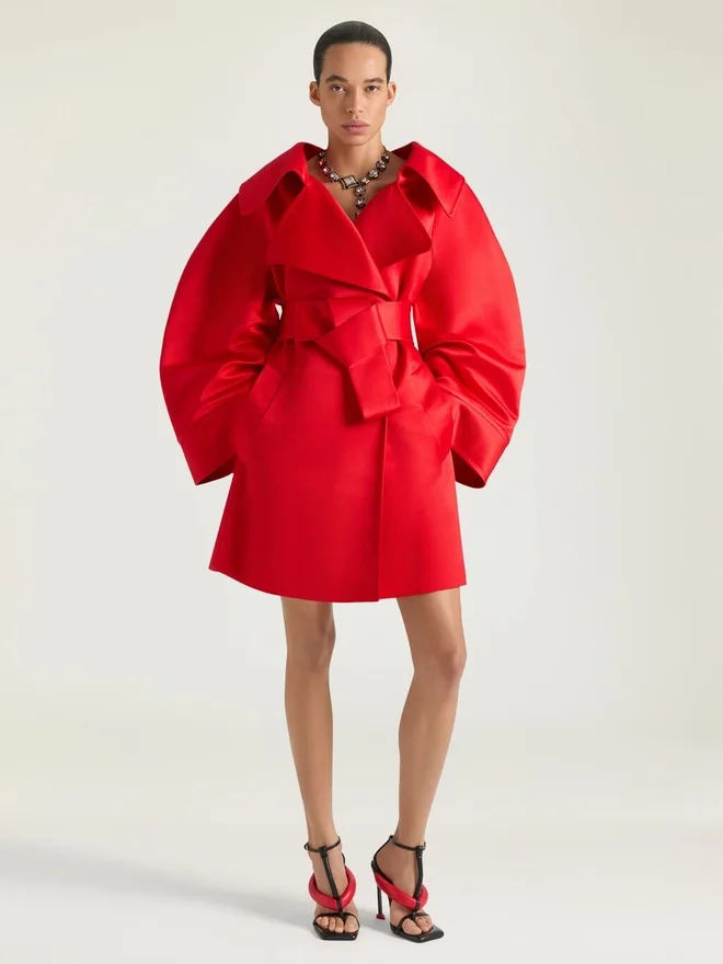 Abrigo corto de satén de seda duquesa. Cuello con solapas maxi. Cinturón desmontable. Dos bolsillos delanteros. Corte holgado. La modelo mide 1,77 m y lleva una talla 36.