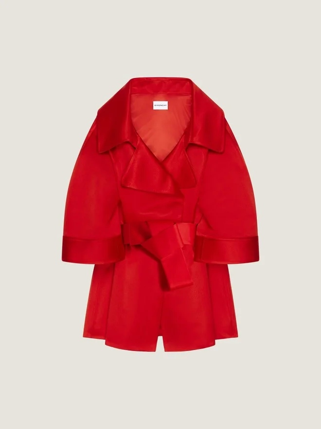 Abrigo corto de seda satén duquesa.Cuello con solapas largas.Cinturón desmontable.Dos bolsillos delanteros.• Corte holgado. • La modelo mide 1,77 m y lleva una talla 36. • Color • Bermellón • Composición • 100 % seda. Forro: 100 % viscosa.Cuidados: • No lavar • Planchar a la temperatura máxima de la suela (110 °C) Sin vaporNo secar en secadoraNo usar lejíaLimpieza en seco con hidrocarburosPaís de origenItaliaCódigo del productoBwc0G11Yg0-640 Información sobre el cuidado: nuestros talleres diseñan con audacia y creatividad prendas únicas, elaboradas con materiales de alta calidad. Para preservar el esplendor de su producto Givenchy, le recomendamos guardarlo en una bolsa de algodón y en un lugar seco y fresco. Se recomienda la limpieza en seco para la mayoría de nuestros productos. Asegúrese de seguir las instrucciones de cuidado que figuran en la etiqueta de su artículo. No dude en visitar nuestra página dedicada o ponerse en contacto directamente con nuestros equipos de Givenchy si desea obtener más información.No lavarPlanchar a la temperatura máxima de la suela (110 °C) sin vaporNo secar en secadoraNo usar lejíaLimpieza en seco con hidrocarburos