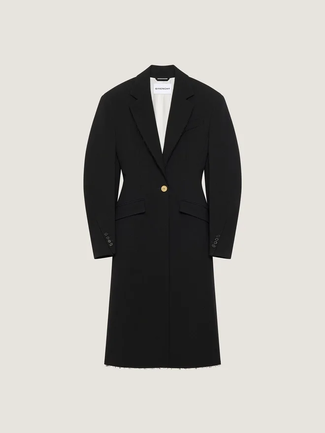 El volumen es exagerado, los patrones se han reelaborado y las costuras se han invertido para dar forma a la silueta de capullo. Abrigo de crepé de lana. Solapa en V. De botonadura simple.• Puños abotonados. • Botón dorado grabado con el logotipo de Givenchy. • Un bolsillo en el pecho. • Dos bolsillos delanteros con solapa. • Bordes sin rematar en el cuello y el bajo. • Costuras de alta costura para crear un volumen envolvente y una cintura entallada. • Forro de satén.La modelo mide 1,77 m y lleva una talla 36.D ColorD NegroD ComposiciónD 90 % lana, 7 % poliamida, 3 % elastano.D ForroD 100 % viscosa.D CuidadosD No lavarD Planchar a la temperatura máxima de la suela (110 °C) sin vaporD No secar en secadoraD No planchar el cuello ni el bajoD No planchar los bolsillosD No planchar los bordes sin rematarD No planchar los botonesD No planchar el dobladilloD No planchar el bajoD No planchar el cuelloD No planchar los bolsillosD No planchar los bordes sin rematarD No planchar los botonesD No planchar el dobladilloD No planchar el bajoD No planchar el cuelloD No planchar los bolsillosD No planchar los bordes sin rematarD Forro: 100 % viscosa. Tratamiento muy moderadoPaís de origenItaliaCódigo del productoBwc0E6167R-001 Información sobre el cuidado: Nuestros talleres diseñan con audacia y creatividad prendas únicas, confeccionadas con materiales de alta calidad.Para preservar el brillo de su producto Givenchy, le recomendamos guardarlo en una bolsa de algodón y en un lugar seco y fresco. Se recomienda la limpieza en seco para la mayoría de nuestros productos. Asegúrese de seguir las instrucciones de cuidado que figuran en la etiqueta de su artículo. No dude en visitar nuestra página dedicada o ponerse en contacto directamente con nuestros equipos de Givenchy si desea obtener más información.No lavarPlanchar a la temperatura máxima de la suela (110 °C) sin vaporNo secar en secadoraNo usar lejíaLimpieza en seco profesional, con tetracloroetileno e hidrocarburos, tratamiento muy moderado