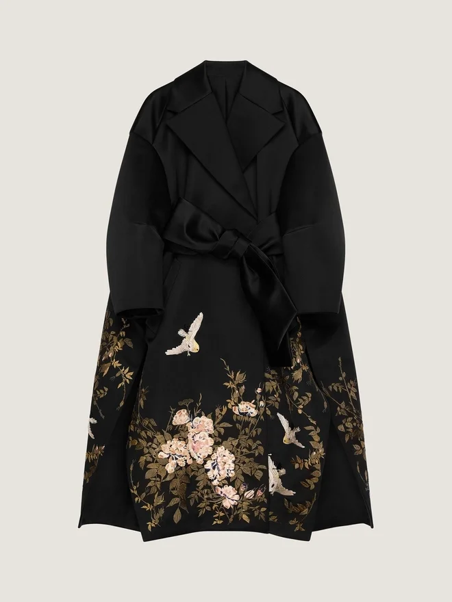 Volumen exagerado, estampados reelaborados y costuras invertidas para dar forma a la silueta de capullo. Abrigo con espalda tipo capa en satén duquesa.