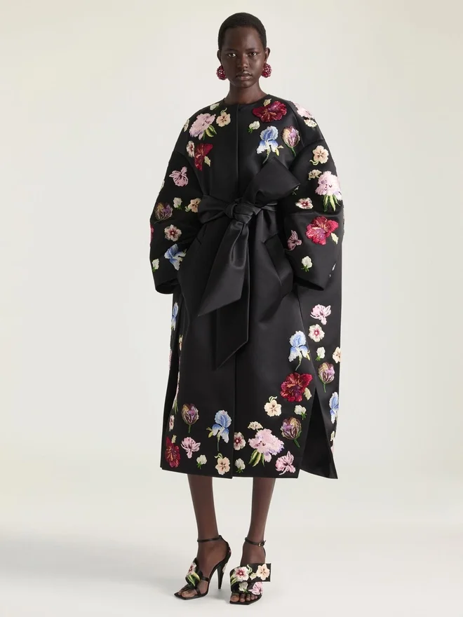 Las siluetas se inspiran en las flores en flor, con camisas de popelín que se desprenden de los hombros como pétalos y vestidos que se desenredan a través de dobladillos con volantes. Los estampados, las sedas y la viscosa presentan motivos florales en jacquard y serigrafía, mientras que los bordados en punto satinado hacen referencia a los archivos de Hubert de Givenchy.Abrigo de satén.Cuello redondo.Bordados florales en hilo de seda.Cierre con botones y cinturón desmontable.Dos bolsillos laterales.• Costuras de alta costura para un volumen envolvente. • La modelo mide 1,77 m y lleva una talla 36. Color Negro Composición 100 % seda. Bordado: 70 % viscosa, 30 % poliéster. Forro: 100 % seda.Cuidados: • No lavar • Planchar a la temperatura máxima de la suela (110 °C) Sin vaporNo secar en secadoraNo usar lejíaLimpieza en seco con hidrocarburosPaís de origenItaliaCódigo del productoBwc0F91Yg0-001 Información sobre el cuidado: nuestros talleres diseñan con audacia y creatividad prendas únicas, elaboradas con materiales de alta calidad. Para preservar el brillo de su producto Givenchy, le recomendamos guardarlo en una bolsa de algodón y en un lugar seco y fresco. Se recomienda la limpieza en seco para la mayoría de nuestros productos. Asegúrese de seguir las instrucciones de cuidado que figuran en la etiqueta de su artículo. No dude en visitar nuestra página dedicada o ponerse en contacto directamente con nuestros equipos de Givenchy si desea obtener más información.No lavarPlanchar a la temperatura máxima de la suela (110 °C) sin vaporNo secar en secadoraNo usar lejíaLimpieza en seco con hidrocarburos