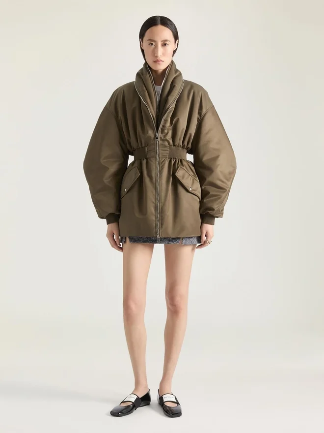 • Bomber de corte de reloj de arena en nylon.• Cuello chal con doble cremallera.• Cierre con cremallera.• Dos bolsillos laterales con solapa.• Cintura y puños elásticos de punto.• Forro en contraste.• Costuras de alta costura para un volumen envolvente y cintura ceñida. • La modelo mide 1,77 m y lleva una talla 36. • Color • Caqui • Composición • 100 % poliamida. Material secundario: 100 % poliéster.CuidadosNo lavarPlanchar a la temperatura máxima de la suela (110 °C) Sin vaporNo secar en secadoraNo usar lejíaLimpieza en seco con hidrocarburosPaís de origenPortugalCódigo del productoBw00Th14Jd-305 Información sobre el cuidado: nuestros talleres diseñan con audacia y creatividad prendas únicas, elaboradas con materiales de alta calidad. Para preservar el brillo de su producto Givenchy, le recomendamos guardarlo en una bolsa de algodón y en un lugar seco y fresco. Se recomienda la limpieza en seco para la mayoría de nuestros productos. Asegúrese de seguir las instrucciones de cuidado que figuran en la etiqueta de su artículo. No dude en visitar nuestra página dedicada o ponerse en contacto directamente con nuestros equipos de Givenchy si desea obtener más información.No lavarPlanchar a la temperatura máxima de la suela (110 °C) sin vaporNo secar en secadoraNo usar lejíaLimpieza en seco con hidrocarburos