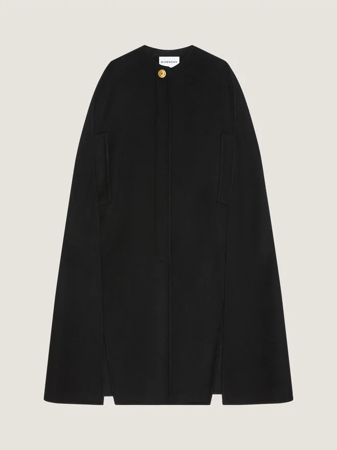 Capa larga de doble cara en lana y cachemira. Cuello redondo. Cierre con botones ocultos. Botones dorados con el grabado de Givenchy. Aberturas en las mangas.