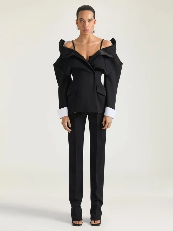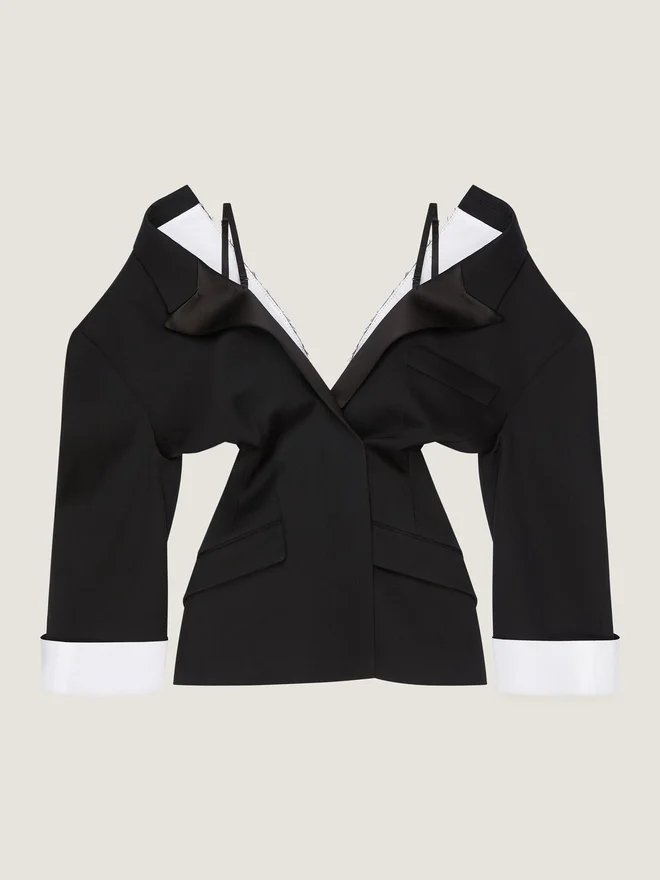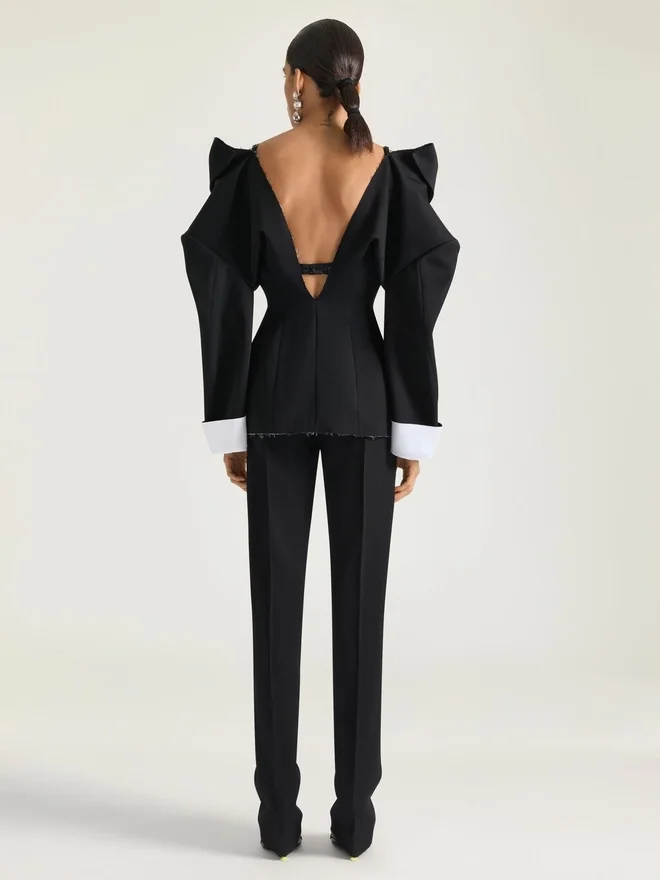La feminidad y la elegancia se expresan en el cuero y los bordados de perlas, con sujetadores que se llevan debajo de las chaquetas y detalles recortados que aparecen en la sastrería, los vestidos y las prendas de punto. Los sujetadores recortados se integran en las prendas para revelar el cuerpo, explorando la interacción entre el vestir y el desvestir.Los arquetipos de la sastrería se cortan, se rasgan y se reconstruyen, desprendiéndose sensualmente de los hombros para revelar el cuerpo. Las costuras de alta costura y los acabados sin rematar expresan la mano del atelier. La espalda está tan cuidada como el frente, haciendo eco del legado de Hubert de Givenchy, con volúmenes esculturales, hombros caídos y caderas abombadas que definen la silueta.Chaqueta de lana Grain De Poudre.Cortes en la espalda.Tirantes finos ajustables.Cierre con botones ocultos en la parte delantera.Un bolsillo en el pecho.Dos bolsillos con solapa en la parte delantera.Detalles de puños blancos desmontables.• Forro de popelín. • La modelo mide 1,77 m y lleva una talla 36. • Color • Negro • Composición • 100 % lana. Material secundario: 100 % seda. Forro: 100 % algodón.CuidadosNo lavarPlanchar a la temperatura máxima de la suela (110 °C) Sin vaporNo secar en secadoraNo usar lejíaLimpieza en seco con hidrocarburosPaís de origen: ItaliaCódigo del producto: Bw30Qe167D-001 Información sobre el cuidado: Nuestros talleres diseñan prendas únicas con audacia y creatividad, elaboradas con materiales de alta calidad. Para preservar el esplendor de su producto Givenchy, le recomendamos guardarlo en una bolsa de algodón y en un lugar seco y fresco. Se recomienda la limpieza en seco para la mayoría de nuestros productos. Asegúrese de seguir las instrucciones de cuidado que figuran en la etiqueta de su artículo. No dude en visitar nuestra página dedicada o ponerse en contacto directamente con nuestros equipos de Givenchy si desea obtener más información.No lavarPlanchar a la temperatura máxima de la suela (110 °C) sin vaporNo secar en secadoraNo usar lejíaLimpieza en seco con hidrocarburos