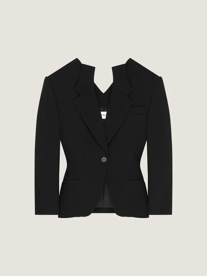 Chaqueta corta estructurada de crepé de lana.Solapa en V.Abertura en la espalda.De botonadura simple.Un bolsillo en el pecho.Dos bolsillos delanteros.Cintura entallada.Forro de satén.La modelo mide 1,77 m y lleva una talla 36.Color:NegroComposición:90 % lana, 7 % poliamida, 3 % elastano. Forro: 100 % poliéster.CuidadosNo lavarPlanchar a la temperatura máxima de la suela (110 °C) sin vaporNo secar en secadoraNo usar lejíaLimpieza en seco profesional, con tetracloroetileno e hidrocarburos, Tratamiento muy moderadoPaís de origenItaliaCódigo del productoBw30Nb166C-001 Información sobre el cuidado: nuestros talleres diseñan con audacia y creatividad prendas únicas, confeccionadas con materiales de alta calidad.Para preservar el brillo de su producto Givenchy, le recomendamos guardarlo en una bolsa de algodón y en un lugar seco y fresco. Se recomienda la limpieza en seco para la mayoría de nuestros productos. Asegúrese de seguir las instrucciones de cuidado que figuran en la etiqueta de su artículo. No dude en visitar nuestra página dedicada o ponerse en contacto directamente con nuestros equipos de Givenchy si desea obtener más información.No lavarPlanchar a la temperatura máxima de la suela (110 °C) sin vaporNo secar en secadoraNo usar lejíaLimpieza en seco profesional, con tetracloroetileno e hidrocarburos, tratamiento muy moderado