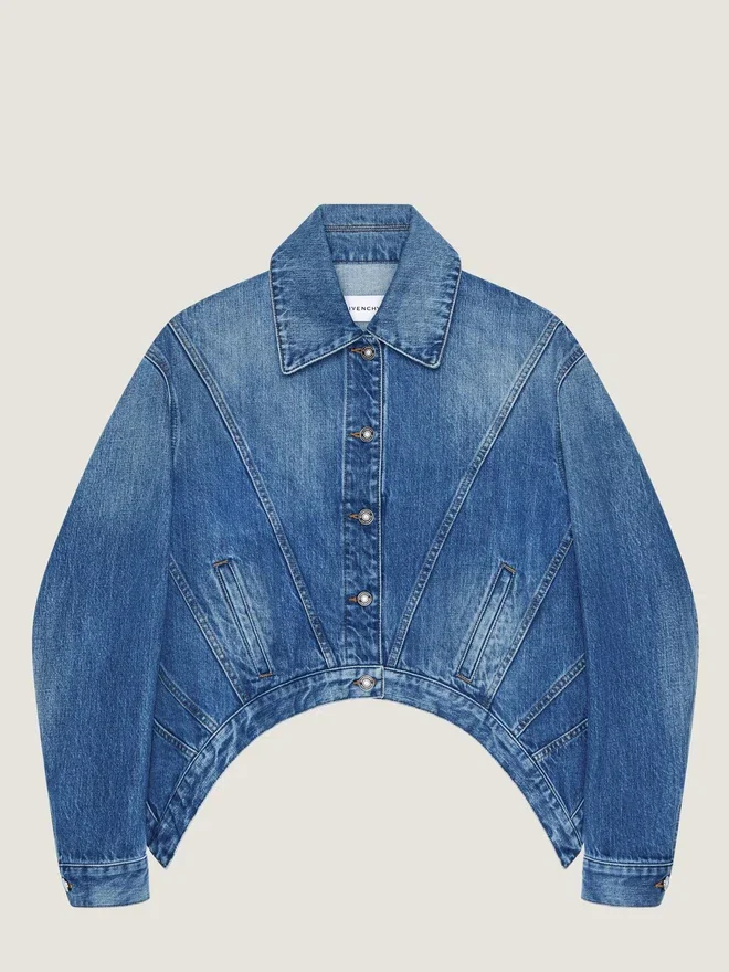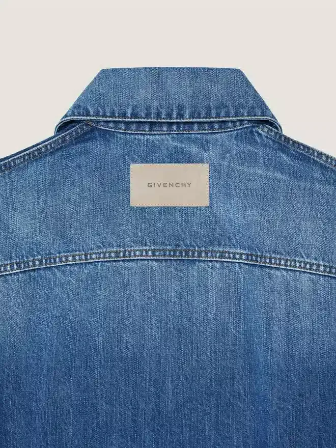 Chaqueta de denim azul medio con efecto lavado. Cuello clásico. Corte trapecio. Parche de gamuza de Givenchy en la parte superior de la espalda. Botones